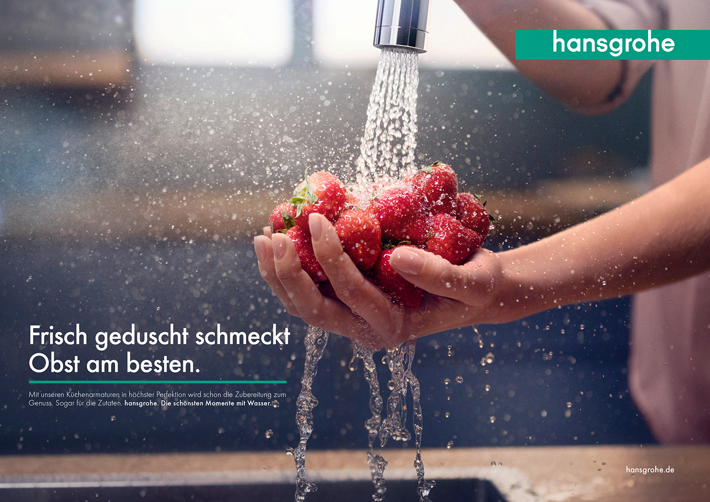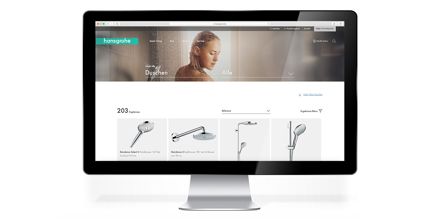 We kept the design very simple to give room for the pictures. The straight type reflects the well designed geometric shapes of hansgrohe products. The green line quotes the logo. Online we made sure there is enough white space as a stage for the products.