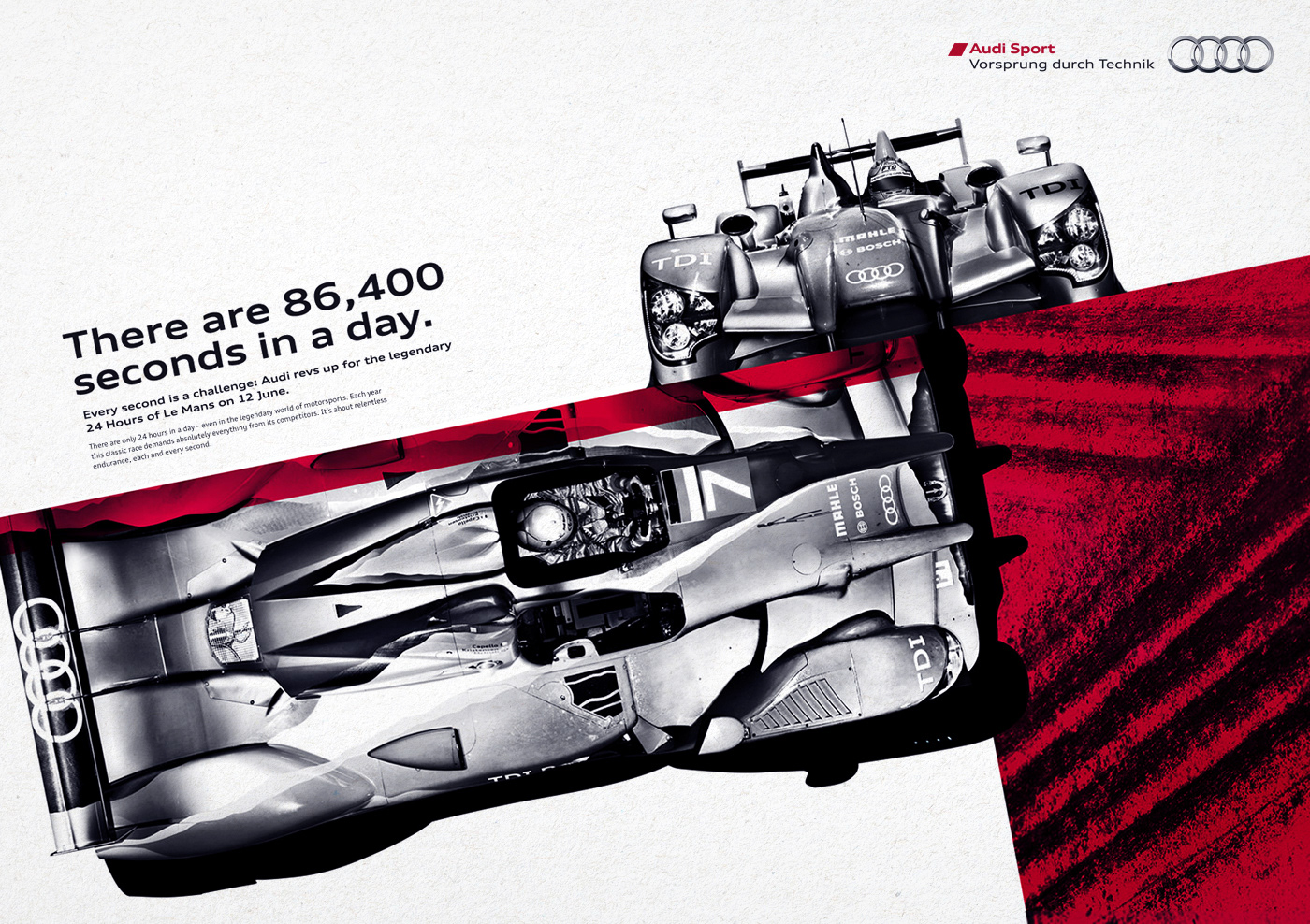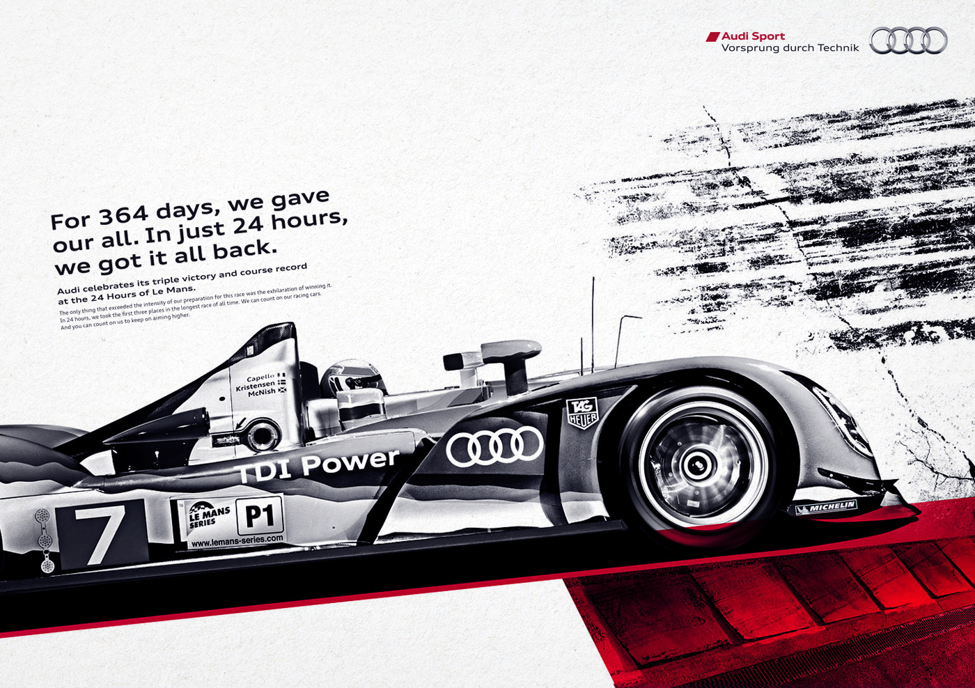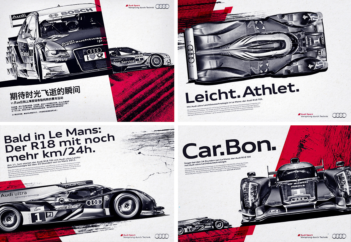 Audi wanted a consistent visual platform for their motorsports communication. We took inspiration from skid marks on race tracks and combined them with iconic black and white photography and red overlays. The visual style was in use for many years – worldwide.