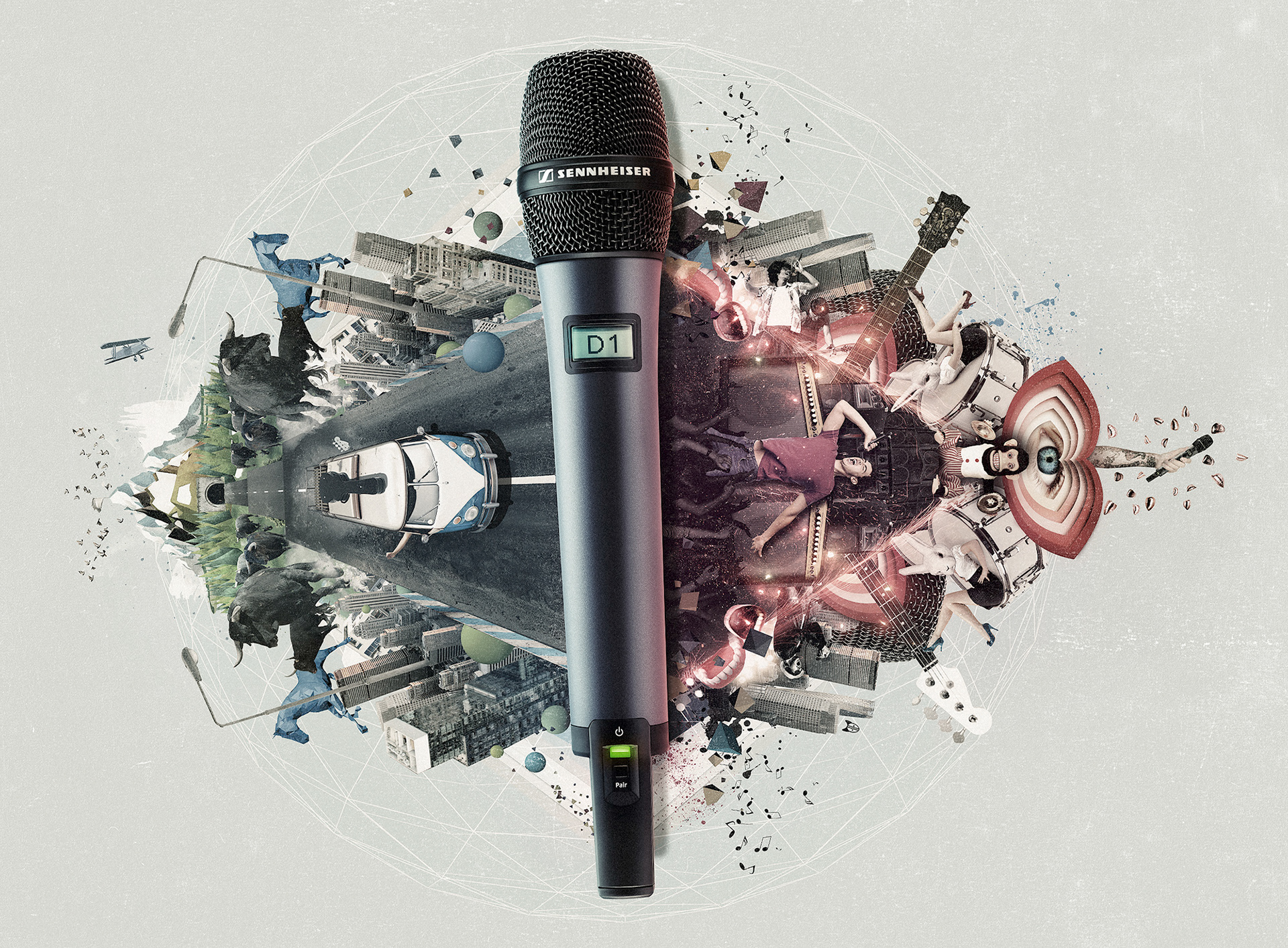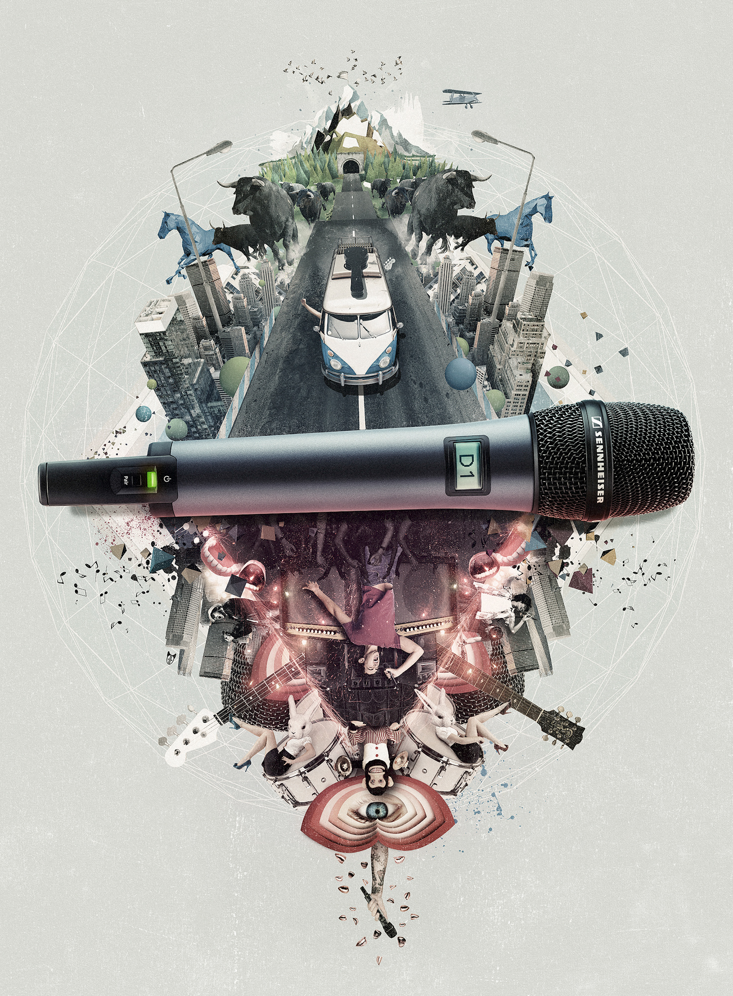 For the new Sennheiser D1 microphone we created a keyvisual that illustrates what can happen to a really ambitious band. It tells the story of a band that arrives in a town with their band bus, plays a great gig and puts the stage on fire.