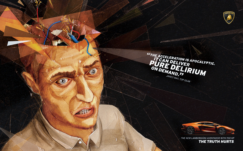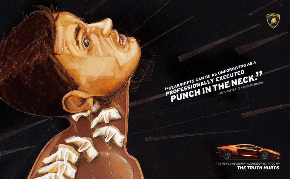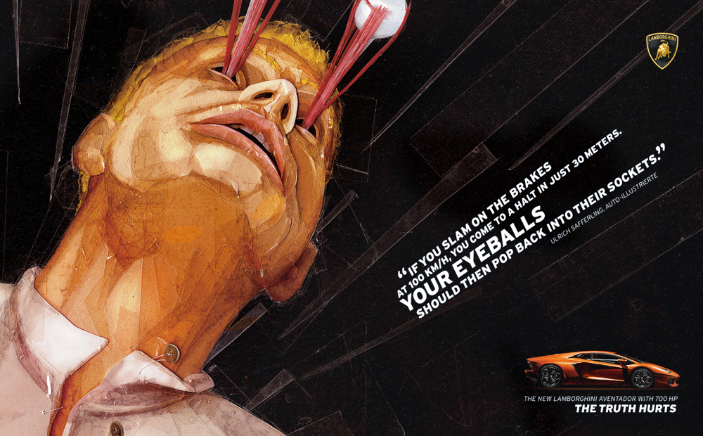 When Lamborghini launched the Aventador with 700HP, car magazines were excited. We noticed that almost every editor was writing about the pain the relentless force of the car provokes. To show the power of the car, we took the real quotes from car magazine editors and portrayed them with powerful illustrations by Berlin based artist Herr Müller. He used different kinds of paper and transparent tape to give a dynamic and relentless impression.